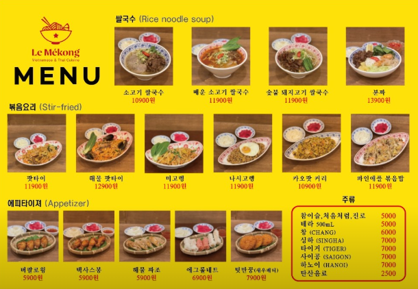 르메콩의 매력은 메뉴 다양성에도 있어요. 쌀국수부터 분짜, 볶음류, 에피타이저까지 종류도 많고 가격도 합리적이에요. 대부분 1만원대 초중반이라 부담 없이 여러 메뉴를 나눠 먹기 좋아요. 아래 표로 정리해봤어요!
